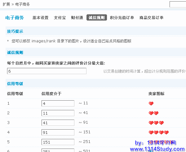 在这里为站点的买卖家设置诚信规则,通过信用度值设置信用图标。站点的会员可以很方便的看到买卖双方的信用度: