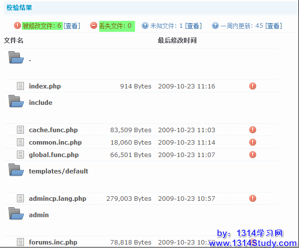 文件校验,这个功能可以使你即时发现论坛程序是否被非法篡改。就是可以看得到你的哪些文件被修改过了,哪些文件是你增加的,哪些文件被删除了,这样都一目了然。那样你可以很快的发现问题或者解决问题。
