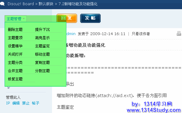 主题和帖子管理主要包括:删除主题、主题置顶、设置精华、关闭打开、主题分类、合并主题、修复主题、提升下沉、高亮显示、主题鉴定、移动主题、复制主题、分割主题等主题管理操作和屏蔽帖子、删除帖子和警告帖子等帖子管理操作。