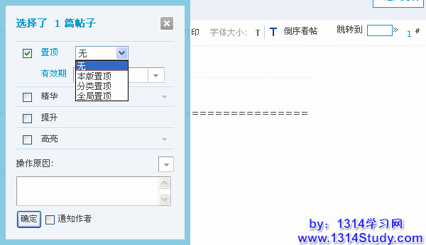 可以选择置顶类型:本版置顶,分类置顶和全局置顶。