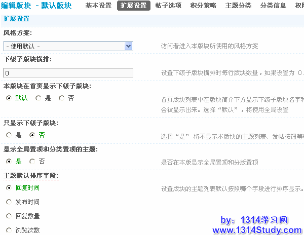扩展设置主要是版块风格及版块下主题列表显示方式等的设置。下面请看详细介绍: