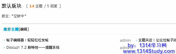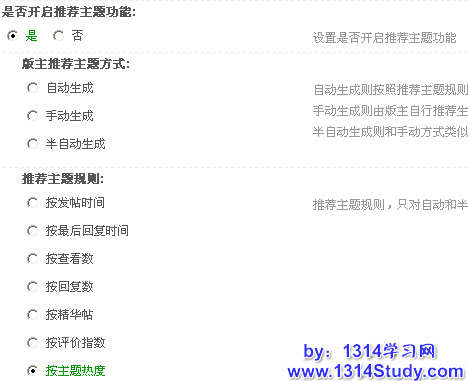 是否开启推荐主题功能:选择“是”,版主在前台可以推荐主题,被推荐的主题将显示到版块的主题推荐中,以提高主题的阅读次数;