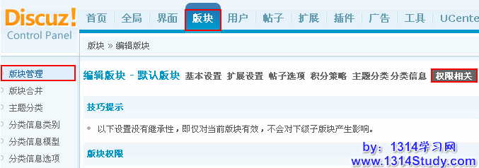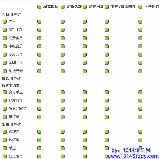 这里主要对版块的访问权限,发表主题和回复权限及附件上传和下载权限进行设置。
