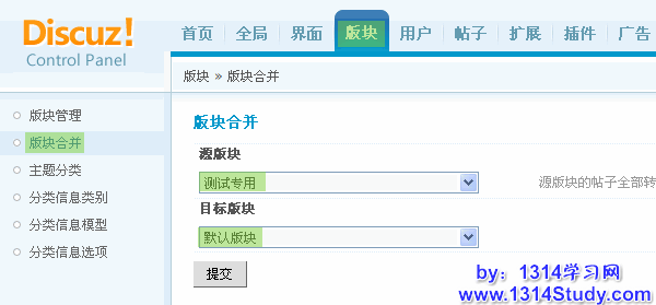 选择“源版块”和“目标版块”,提交即可,源版块的帖子全部转入目标版块,同时删除源版块。