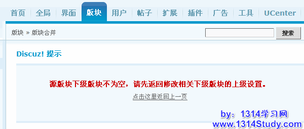 2)源版块是个有子版块的版块,目标版块是子版块:则无法顺利合并,提示如上图所示。