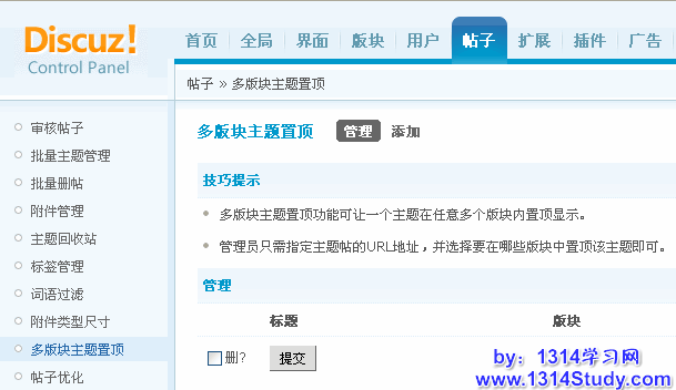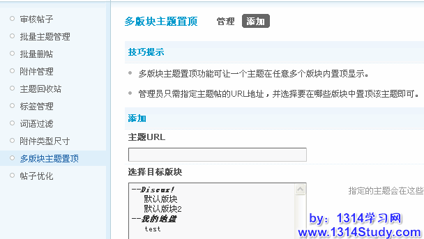 多版块主题置顶功能可让一个主题在任意多个版块内置顶显示,管理员只需指定主题帖的URL地址,并选择要在哪些版块中置顶该主题即可。