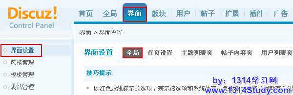全局设置,关系到整个论坛站点的界面。管理后台 => 界面 => 界面设置 => 全局: