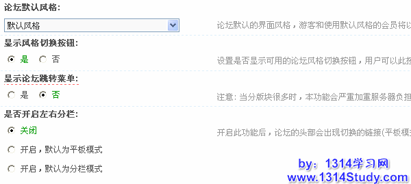 论坛默认风格:设置论坛默认使用的风格。游客或使用默认风格的会员浏览时将显示该风格;