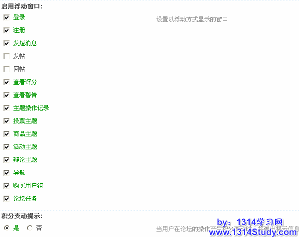 积分变动提示:选择“是”,当用户在论坛的操作产生积分变动时,将弹出提示信息告知用户。