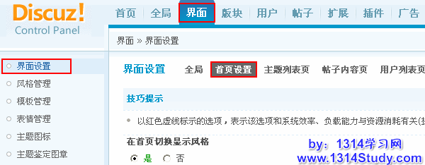 首页设置涉及到的是论坛首页界面的显示。Discuz!7.2后台 => 界面 => 界面设置 => 首页设置,如下图: