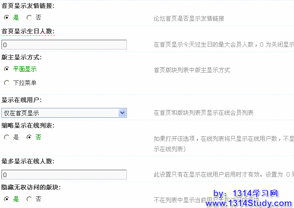 显示在线用户:可以设置仅在首页显示在线用户,或者仅在分版块显示在线用户,或者首页和分版块全部显示;