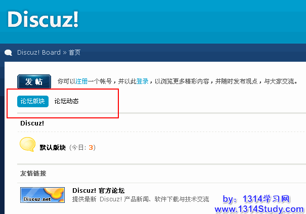如果开启了首页切换显示风格,并且设置了首页默认显示风格为“经典版块列表”,那么打开首页,显示如图: