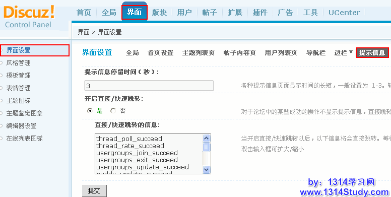 这里主要设置论坛操作时的提示信息显示方式。Discuz!7.2后台 => 界面 => 界面设置 => 提示信息: