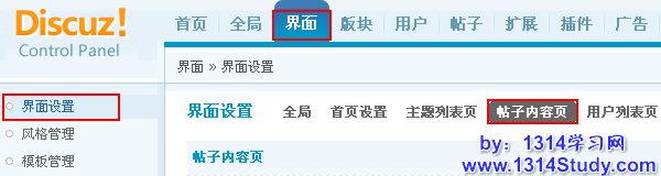这里主要设置浏览帖子内容时显示的界面风格。Discuz!7.2后台 => 界面 => 界面设置 => 帖子内容页: