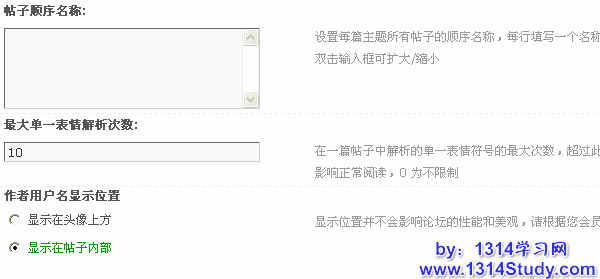 作者用户名显示位置:设置帖子内容页作者用户名显示在头像上方还是显示在帖子内部。显示位置并不会影响论坛的性能和美观,请根据您会员的浏览习惯进行选择;