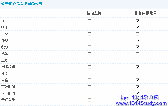 设置用户信息显示的位置:设置用户信息显示在贴内左侧还是显示在用户头像菜单。