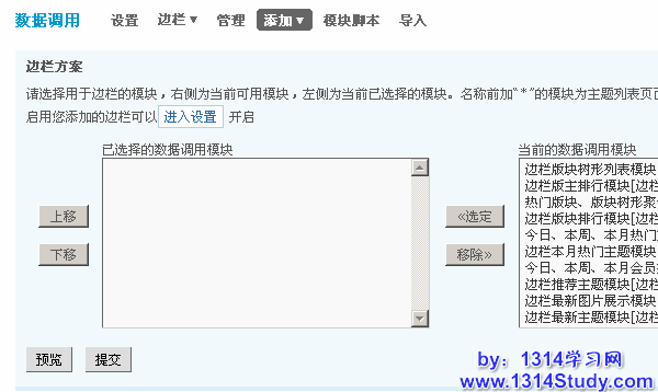 可以从边栏设置方案中选择一个现有的论坛方案,也可以直接勾选下方模板列表中需要显示的调用模块,设置好之后,点击“提交”即可成功设置首页的边栏。如下图所示: