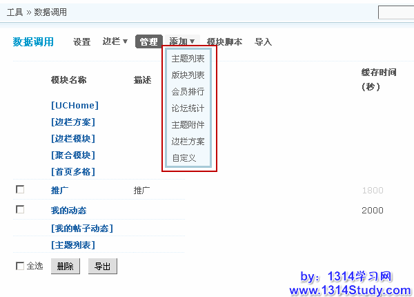 点击导航上面的“添加”,会出现下拉菜单,里面包括了所有可以创建的调用项目:主题列表、版块列表、会员排行、论坛统计、主题附件、边栏方案、自定义,如下图所示:
