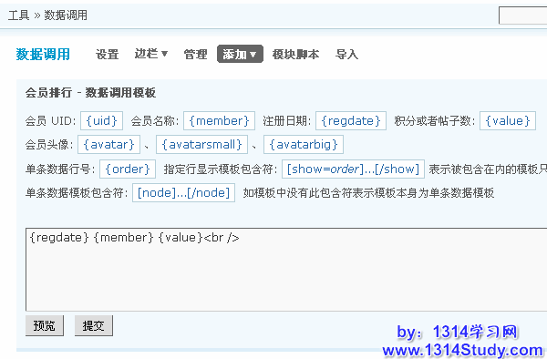 在数据调用模板显示区中,可以根据输入框上面列出来的项目直接通过点击添加到输入框中的当前光标出。在输入框中需要根据上面的信息来书写用于显示的模板。