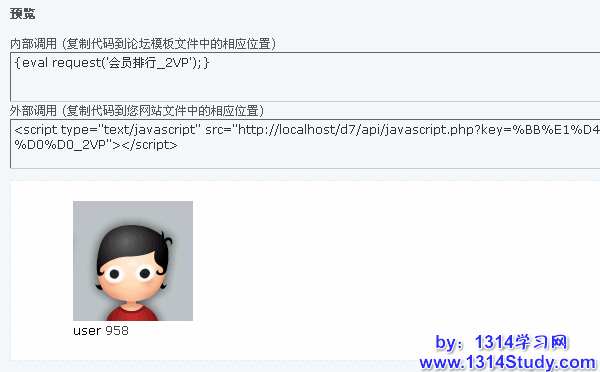 其他调用,如主题列表、版块列表、论坛统计、主题附件、自定义的调用方法同会员排行的调用方法类似,则不再赘述。需要特别说明的是,“自定义”调用,可以自由书写 HTML 代码,也可以将已添加的调用插入到自定义调用中,形成灵活的调用方式,所以需要添加自定义代码的调用则添加此调用即可。