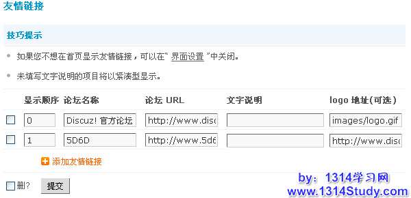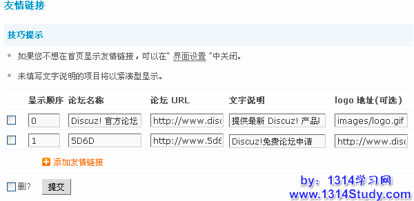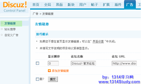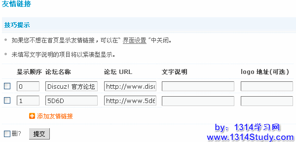 上图中可以看到系统默认自带一个 Discuz! 官方站点的友情链接。