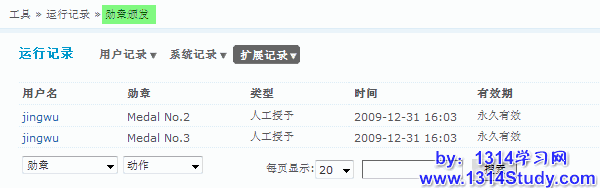 勋章颁发记录着所有的勋章的颁发和收回的信息。可以通过左下角的下拉菜单来选择自己想要关注的勋章颁发信息。可以通过页面右下角的搜索您需要的勋章管理信息。