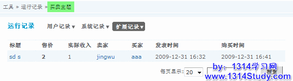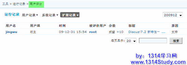 用户评分记录记录着在所有用户的评分记录,就是用户是否是在恶意评分或者版主评分是否不公正,都做到有证可查。这个记录同样可以通过 用户名,被评用户名,分数,标题,原因。同样,可以通过页面右下角的搜索查看您需要查看的信息。