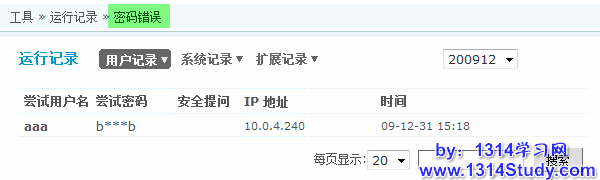 密码错误记录用户在登录的时候,多次尝试密码登录。更及时发现猜测密码的用户,或者忘记密码的用户,并帮助用户找回密码等。尝试密码是记录不完全的,这点是为了保护用户的隐私而设计的。只有部分字符而已。可以通过页面右下角的搜索查看您需要查看的信息,通过ip地址信息,或者用户名查找您需要的信息。