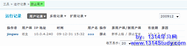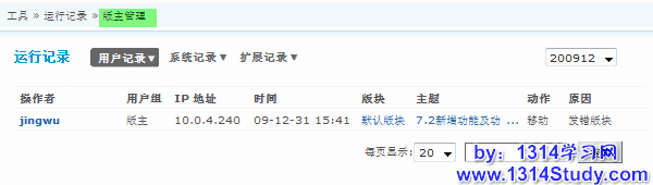 用户记录:记录用户执行的或被执行的一些操作,包括:忘记密码、禁止用户、版主管理。