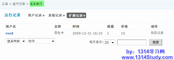 道具操作记录着前台道具市场的购买记录,和用户使用道具的记录。通过这个记录您可以全面的了解当前道具的使用情况。这个记录是存储在数据库里面的,所以查看的条件比较多,可以很精确的查看到您需要的记录。可以通过页面右下角的搜索您需要的道具操作信息。