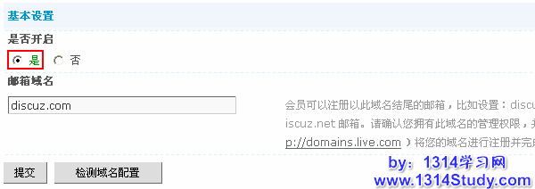 “是否开启”设置为“是”,“邮箱域名”设置一下域名,如 admin.com,然后提交,设置完成。