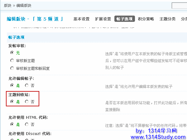 需要注意的是这个功能需要在 Discuz! 后台开启才可以,首先这个功能是跟每个版块关联的,所以每个版块都有此项设置,即可以控制哪些版块开启主题回收站的功能。在管理中心 => 版块 => 版块管理 => 编辑要开启主题回收站的版块 => 帖子选项中,就可以设置这个版块开启或者关闭回收站。
