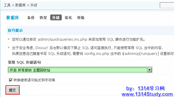 如果版块太多,一个一个版块开启太麻烦的话,还可以到管理中心 => 工具 => 数据库 => 升级的“常用 SQL 升级语句”里面选取“开启所有版块主题回收站”。