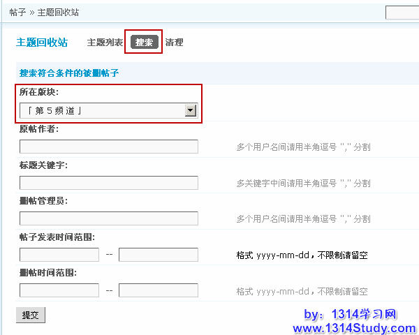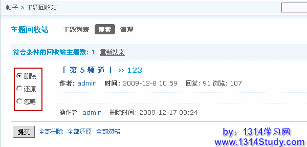 主题回收站中,可以根据不同的版块,作者,标题关键字,删除管理员,帖子时间等等条件进行搜索,并对搜索出来的帖子进行处理。