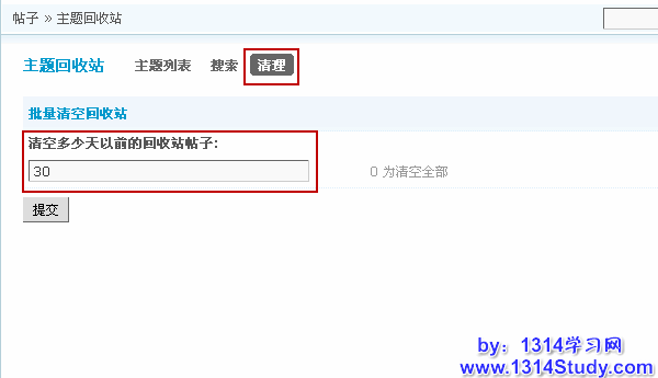 清理功能可以对回收站中删除时间超过了指定天数的帖子进行清空。避免回收站过大,占用太多数据库空间。