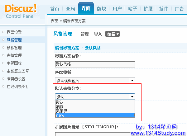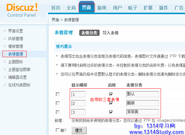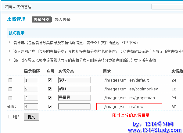 然后,在论坛后台 => 界面 => 表情管理里就可以看到该表情目录,如下图所示:
