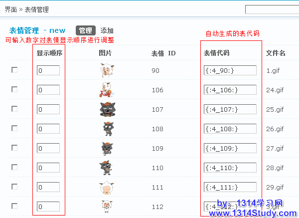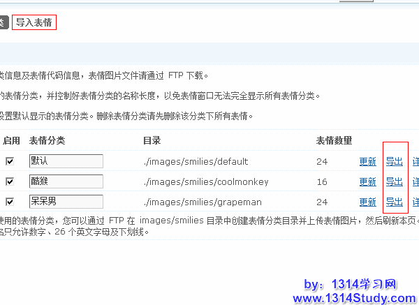通过表情管理功能,站长可以自由的选择启用或关闭表情,还可以导入、导出或添加、删除表情等。