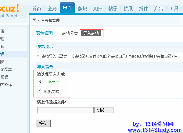 2、如果想导入从其它Discuz!论坛后台导出的表情,可以点击上方的“导入表情”按钮,如下图所示: