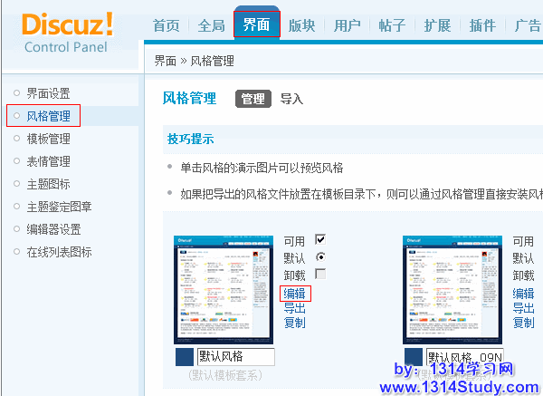 Discuz! 论坛后台 => 界面 => 风格管理 对当前默认风格进行编辑,如图所示: