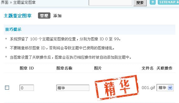 3、关联到其他关联操作:默认的只有3个可以关联的操作:精华、置顶、推荐;如果设置了关联,图章会在执行相应操作时被自动添加到主题中;