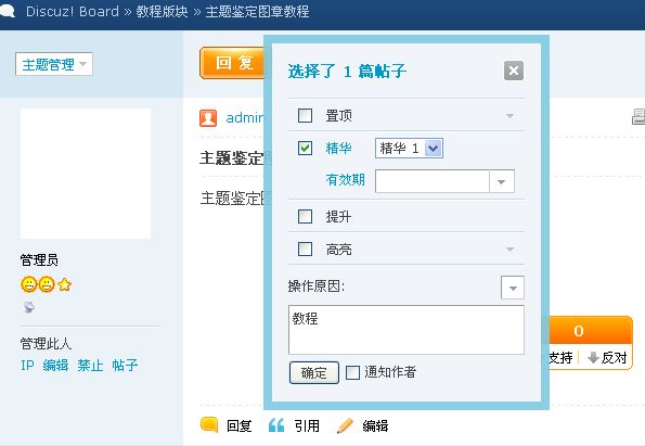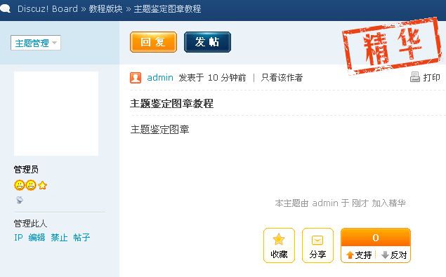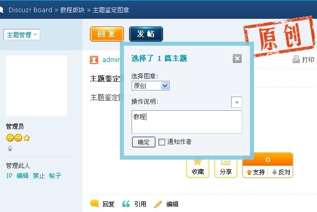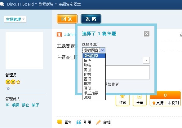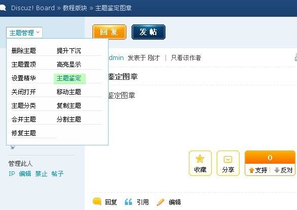 4、直接给帖子主题添加鉴定图章:前台使用管理组的账号,在帖子内部的头像上方的主题管理可以看到主题鉴定,如图: