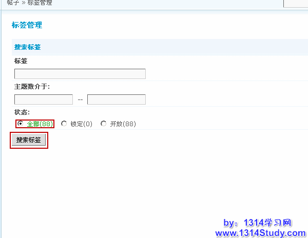 默认是搜索页面,可以按照标签名称,主题数量,状态三个条件进行搜索。其中状态之后括号里面的数字,代表当前状态下的标签的数量。写好搜索条件后,点击“搜索标签”,就可以搜索出来符合条件的标签了。
