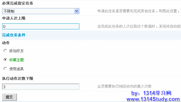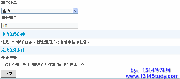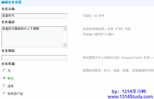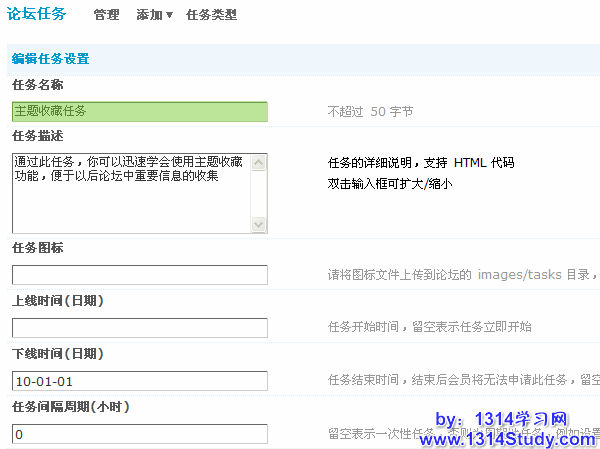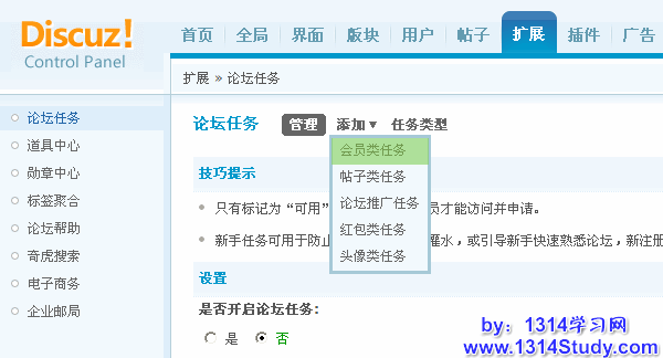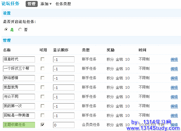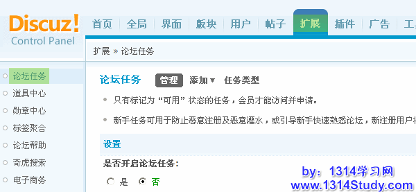 论坛后台 => 扩展 => 论坛任务,显示论坛任务设置界面,如下图所示,