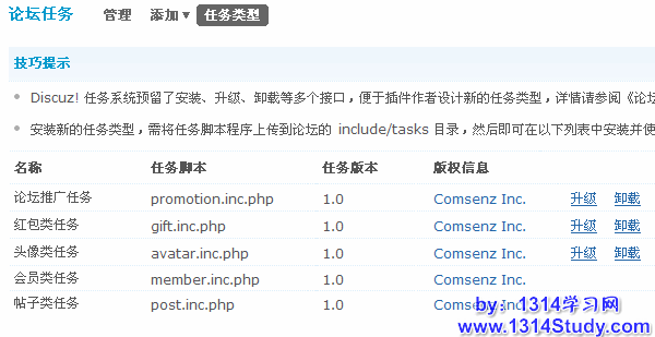 Discuz! 任务系统预留了安装、升级、卸载等多个接口,便于插件作者设计新的任务类型;