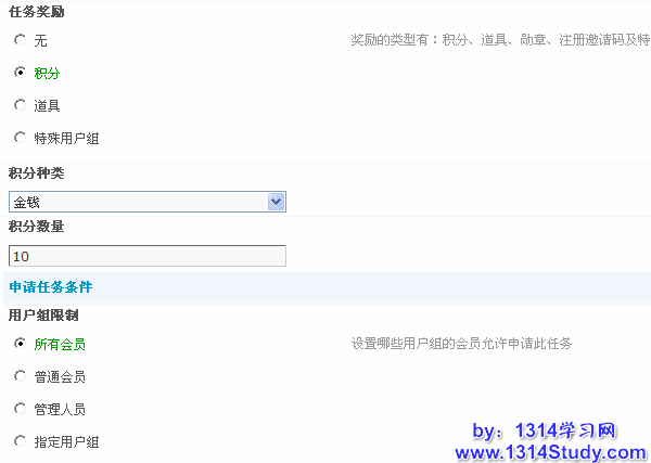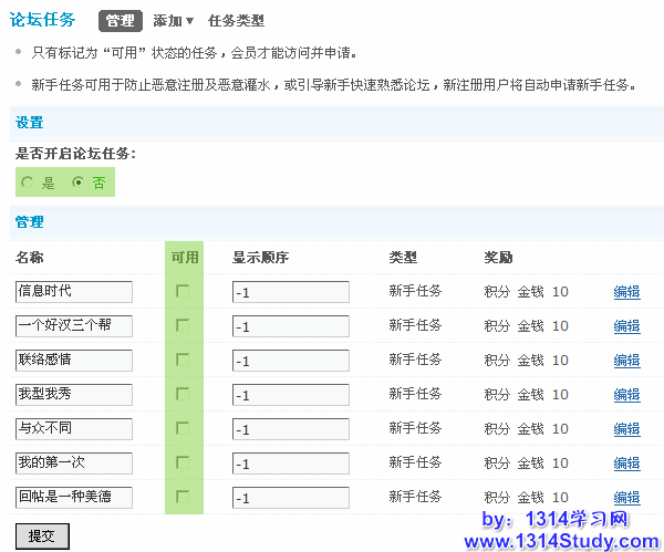注意:只有开启论坛任务,下面对任务的设置才会起作用。单个任务名称后面的“可用”复选框勾选后,会员才能访问并申请相应的任务。