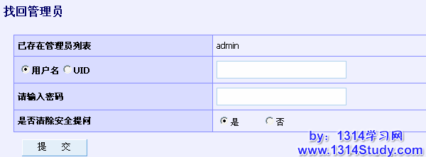 此功能可以帮助站长找回遗忘的管理员,如果应用和 Ucenter 的通信方式是基于 MySQL 进行的,在这个页面就可以完成管理员权限的提升、密码的更改、安全问答的去除等。或者站长可以在此处把用户提升管理员后到 Ucenter 中更改用户的密码信息。