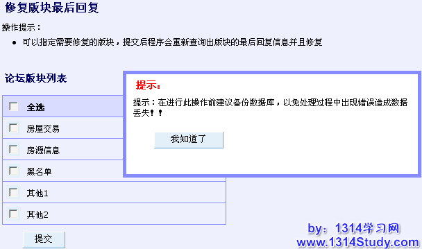 选择要修复最后回复的版块,点击“提交”即可。