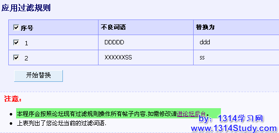 如果论坛还没有过滤规则或需要修改过滤词语,请先到后台设置。设置好后,点击“开始替换”,程序会自动批量替换。