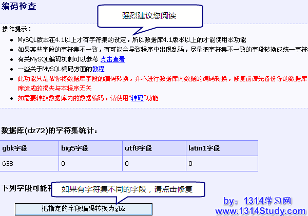 本功能对所有数据表进行编码检查,如果有字段的编码与主要的编码不一致,能够在一定的情况下利用tools修正。