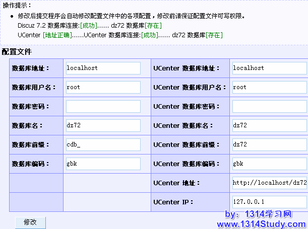 此功能可以修改论坛根目录下 config.inc.php 中数据库的配置。修改后,提交,程序会自动修改配置文件中的信息。前提是论坛根目录下的 config.inc.php 可写。